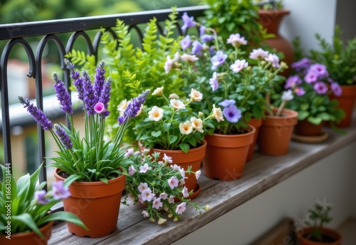 Obraz premium a small balcony garden with potted ferns, lavender, and catmint producing...