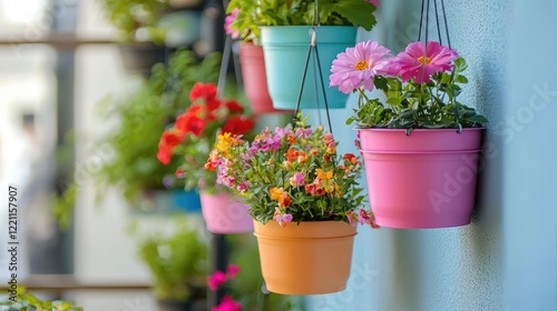 Fototapeta premium A small balcony with hanging flower pots in bright and pastel colors.