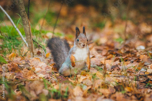 © Dmitrii, Fototapeta premium a small beautiful squirrel is looking for nuts in the autumn forest to stock up for the winter