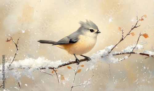 © TheoTheWizard, Obraz premium A small bird is perched on a branch covered in snow