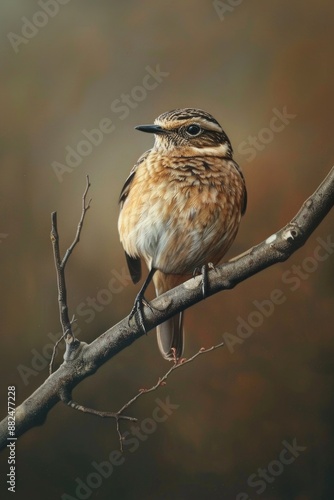 © Fotograf, Fototapeta premium A small bird is perched on a tree branch, looking out at the camera