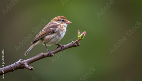 Fototapeta premium a small bird perched on a broken branch beginning to bud again, concept of...