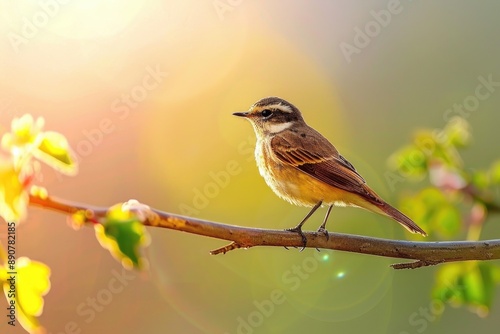 © Fotograf, Fototapeta premium A small bird perches on a branch of a tree, surrounded by green leaves