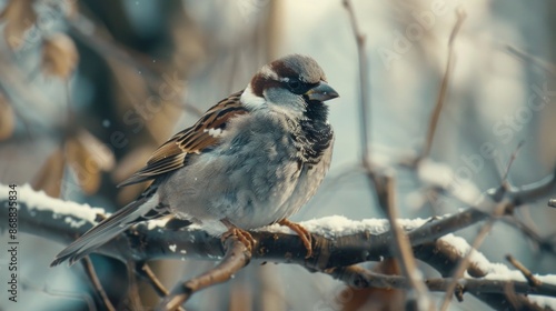 Naklejka premium A small bird perches on a snowy branch, providing a cozy winter scene