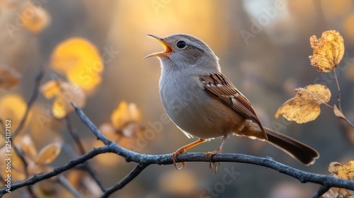 Fototapeta premium A small bird sings perched on a branch in autumn