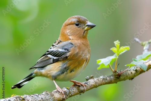 Fototapeta premium A small bird sits quietly on a branch of a tree, waiting for its next move