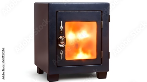 © Saroch, Fototapeta premium A small, black safe with a glowing interior, suggesting warmth and security, possibly representing a fireproof design.
