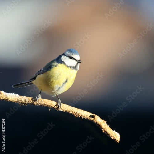 Obraz premium a small blue and yellow bird is sitting on a tree branch