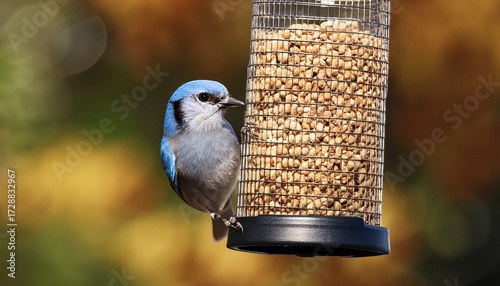 © Faustino, Naklejka premium a small blue bird perched on a feeder filled with seeds and suet balls