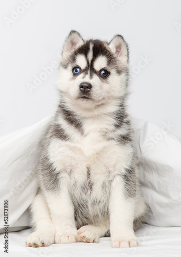 Obraz premium A small blue-eyed husky puppy lying under a blanket at home and laying his...