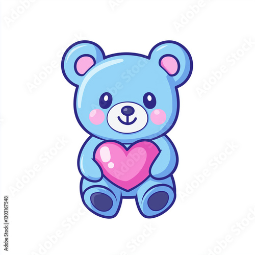 © Nobelus, Naklejka premium A small blue teddy bear with a pink heart, sitting happily in a cartoon design. A perfect representation of warmth, love, and care
