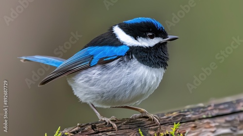 © lililia, Obraz premium A small, blue-winged fairy wren perches on a branch with a blurred green background