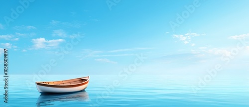 Naklejka premium A small boat floats on a expansive body of water, surrounded by a blue sky...