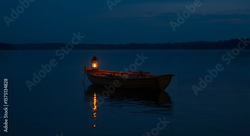 © Yoena, Naklejka premium A small boat sits on a calm lake at night, illuminated by a single lantern.