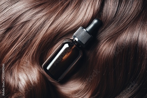 Fototapeta premium A small bottle of liquid sits atop a woman's brown hair
