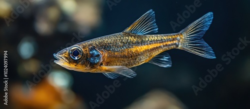 © MBRAMO, Fototapeta premium A small, brown and blue fish with a large eye swims in an aquarium with a blurry background.