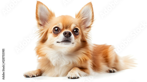 © Watcharin, Obraz premium A small brown and white dog with a fluffy tail laying on a white background