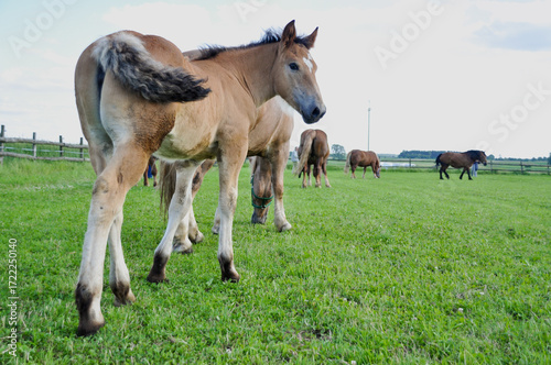 © Aldona, Fototapeta premium A small brown foal grazes in the meadow among the horses