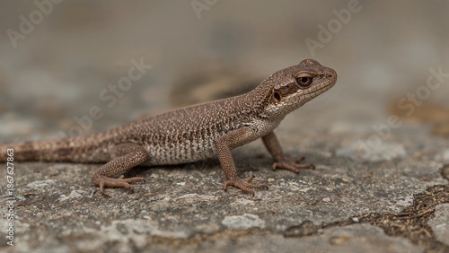 © Lasvu, Naklejka premium A small brown lizard on a rocky surface.