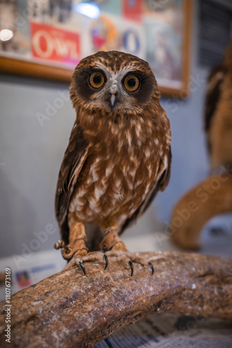 © Aerial Film Studio, Fototapeta premium A small brown owl with vivid yellow eyes perches on a textured branch indoors in Hiroshima, facing the viewer with a leg band visible and posters on the wall.