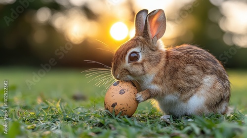 © Ascents, Fototapeta premium A small brown rabbit enjoys a speckled Easter egg at sunset.