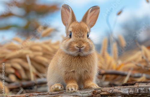 © Vadim, Fototapeta premium A small brown rabbit is standing on a log. The rabbit is looking at the camera with its eyes wide open
