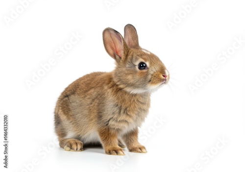 © Vooglo.com, Fototapeta premium A small brown rabbit sits attentively on a white background, looking to the right of the frame