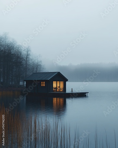 © SUNSU, Fototapeta premium A small cabin is sitting on a dock in front of a lake