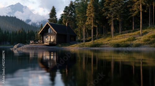 © Babb, Fototapeta premium A small cabin is surrounded by trees and a lake