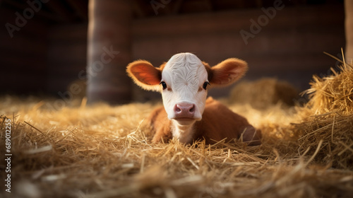 Fototapeta premium A small calf lying in the straw