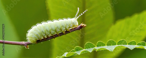 Fototapeta premium A small caterpillar is sitting on a large leaf, its body and legs clearly visible