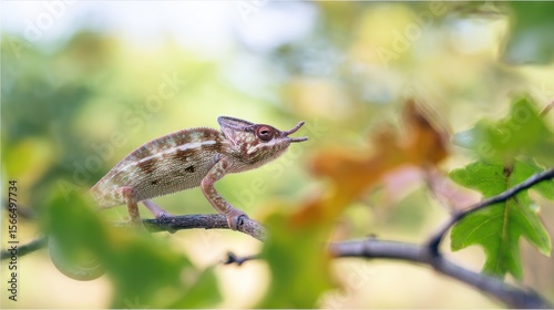 © Mikus, Obraz premium A small chameleon sitting on a tree branch