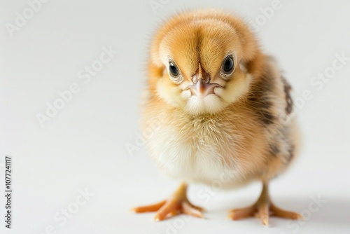 Fototapeta premium A small chicken standing on a white surface