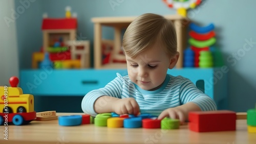 Fototapeta premium A small child is playing with wooden cubes in the playroom. An educational...