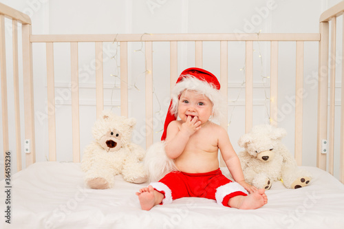 Obraz premium a small child is sitting in a crib in a Santa hat with stuffed toys bears,...