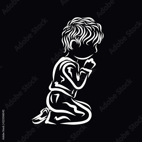 Fototapeta premium A small child prays while kneeling, a white sketch on black