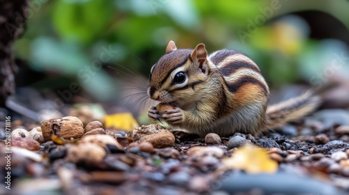 Obraz premium A small chipmunk eats a nut on the forest floor