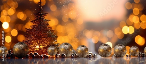 © akhmad, Fototapeta premium A small Christmas tree with gold ornaments sits on a snowy ground