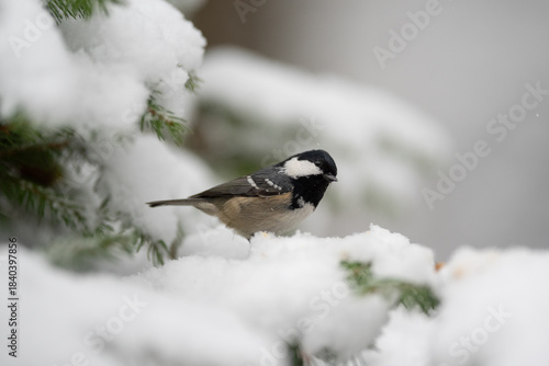 Obraz premium A small Coal Tit bird perches on a snow-covered evergreen branch in a forest....