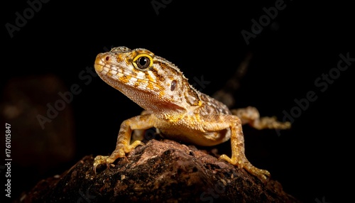 © Singkong, Fototapeta premium A small, colorful lizard perched on a dark rock
