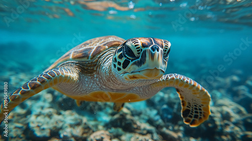 © Tabinda, Fototapeta premium A small, colorful turtle with a detailed shell. It's orange, brown, and gray.