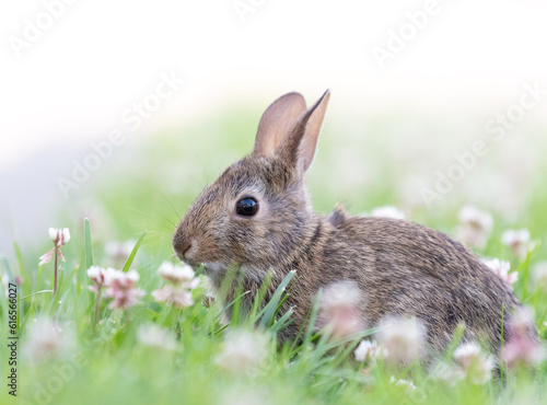 Fototapeta premium A small cottontail rabbit sits in a field of clover.