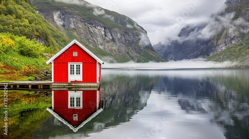 © Stavros, Fototapeta premium A small cozy house on the shore of a picturesque lake in the mountains. A picturesque escape from the chaos of everyday life. A place for privacy from the city noise.