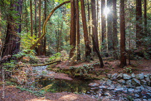 Obraz premium A small creek winds through tall redwood trees with the sun bursting between them in Muir Woods on a hiking trail