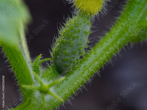 © Milan, Naklejka premium A small cucumber growing on its plant with a dark background