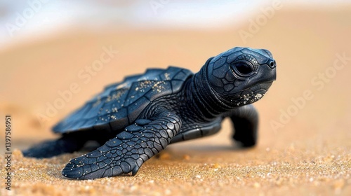 © BerkahStock, Obraz premium A small, dark-colored sea turtle hatchling crawls on a sandy beach towards the ocean.