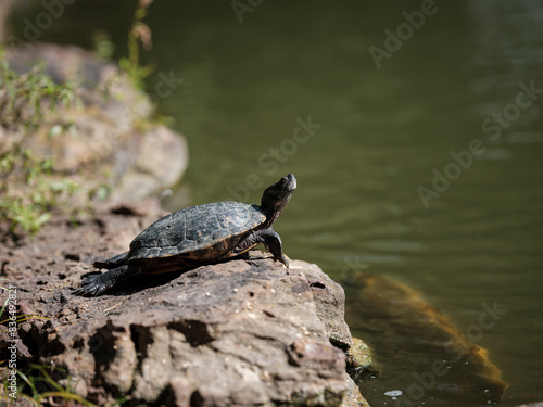 © Phil Harvey, Obraz premium A small, dark-colored turtle is perched on a rock near the edge of a pond with his head raised, appearing to be looking out at something.