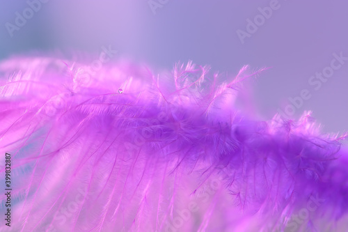 Obraz premium A small drop of water on a purple feather. Beautiful abstract macro. Spring tender background. Selective focus.