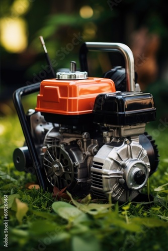 Fototapeta premium A small engine is placed on a beautiful, vibrant green field. This image can be used to represent agriculture, machinery, or outdoor activities