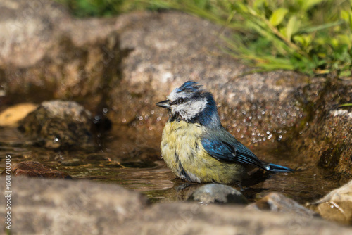 © JGade, Naklejka premium A small Eurasian blue tit, with its distinctive blue, yellow, and white plumage, is seen standing in shallow water among rocks